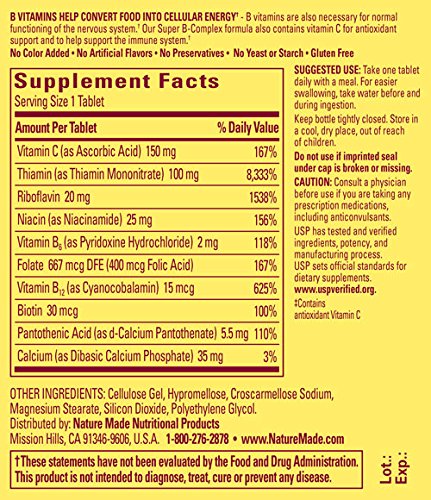 Nature made super b complex with vitamin c and folic acid helps convert food into energy. Vitamin b is also necessary for normal functioning of the nervous system.