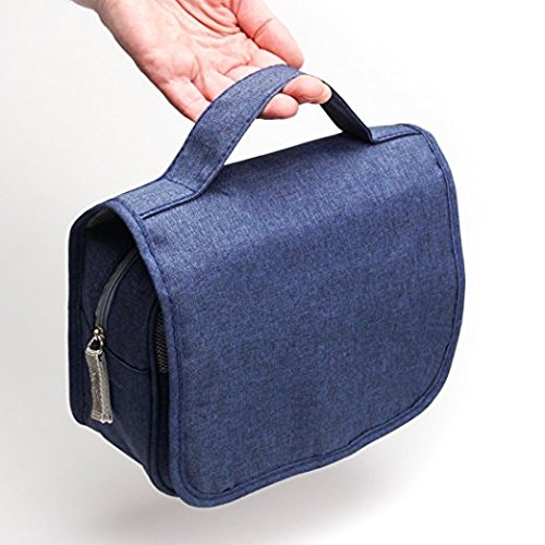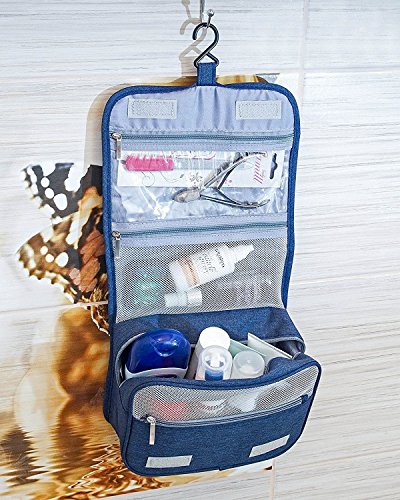 - Cosmetic bag has built-in durable hanging hook that allows you to hang it on the towel rack, shower, and bathroom door. Moreover, portable travel kit is foldable and will save space in the suitcase.