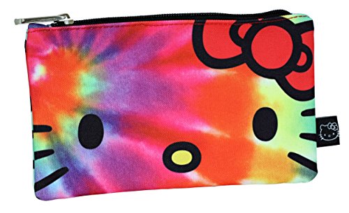 Loungefly and Sanrio Hello Kitty collaborated and came up the cutest little hippy Hello Kitty accessory bag ever! This rainbow tye dye school zip pouch features the classic Sanrio Hello Kitty face and bow. Perfect for make-up, tech gadgets, or pens and pencils. Printed on back and front. Made of heavy woven nylon. Fully lined. Zip closure with Loungefly silver-tone embossed zipper pull. Measures 8 in x 4.5 in. Vegan-friendly.Feature