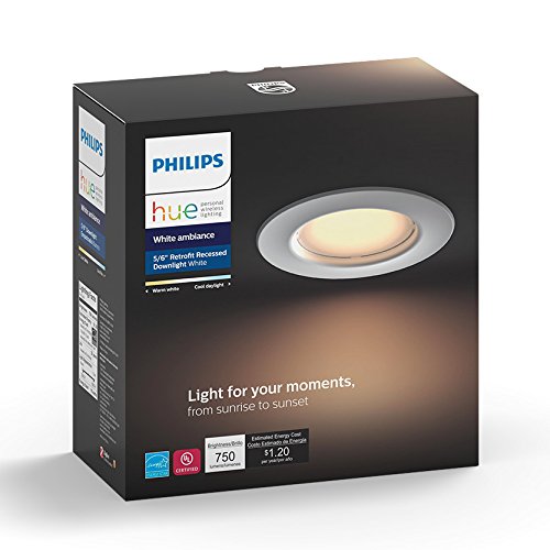 From sunrise to sunset, the Philips Hue White ambiance dimmable LED smart retrofit recessed downlight changes how you light your moments at home. With wireless control on your smartphone or tablet, choose the perfect light setting for any mood or activity such as reading or relaxing, concentrating, or energizing Requiring the Philips Hue bridge (sold separately) for the full Hue experience, this easy-to-install light features a medium based E26 socket adapter and is suitable for both wet and dry locations Install this powerful 750-lumen light anywhere you would a standard recessed downlight and pair with the Hue bridge, allowing you to control this and other Philips Hue lights via the Philips Hue app Easily expand your Lighting system with accessories (sold separately), such as a Hue dimmer switch, Hue tap, or Hue motion sensor. Pair it for automation with your existing Nest or SmartThings system This box includes one Philips Hue retrofit recessed downlight with manual and two-year warranty.Feature