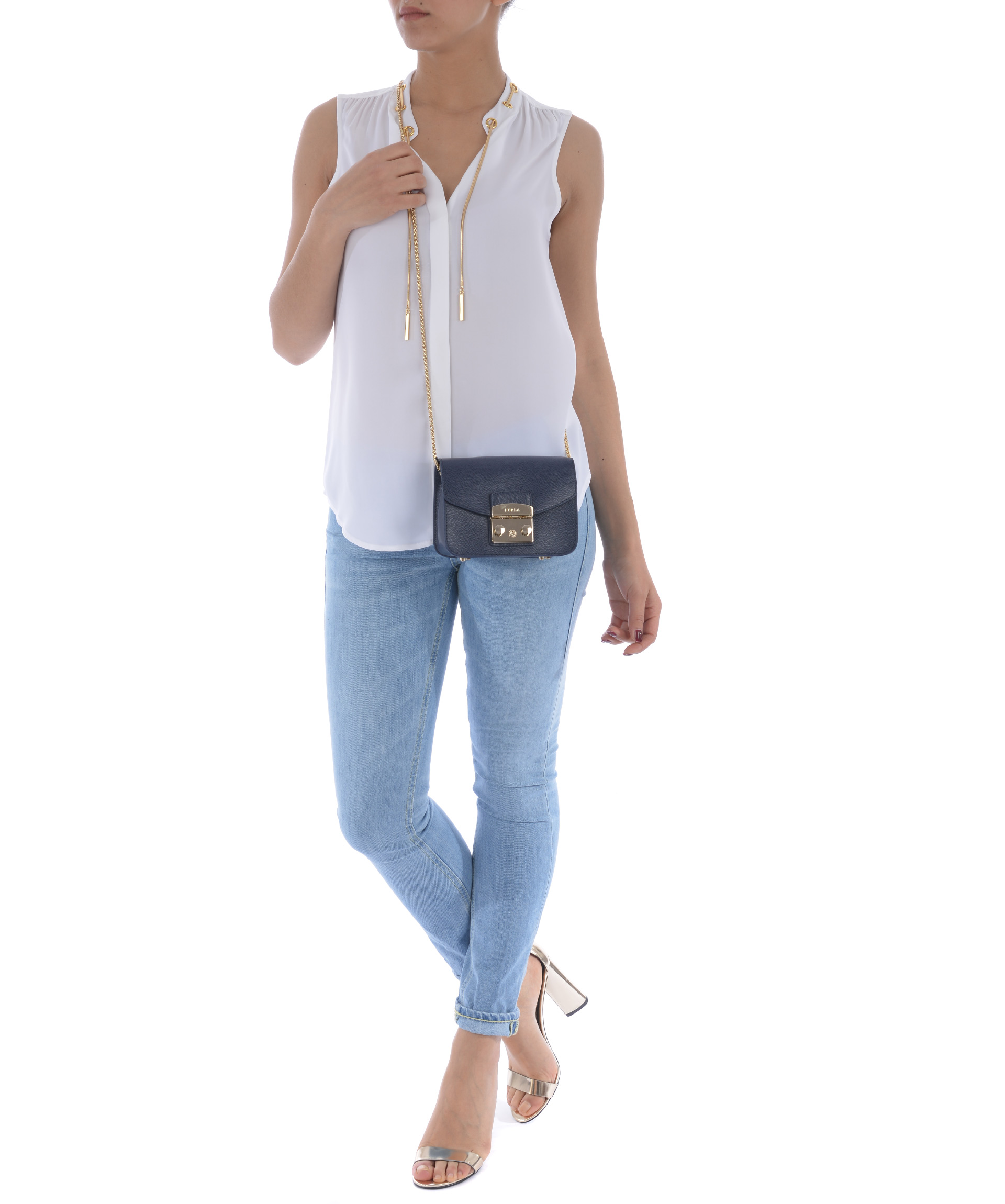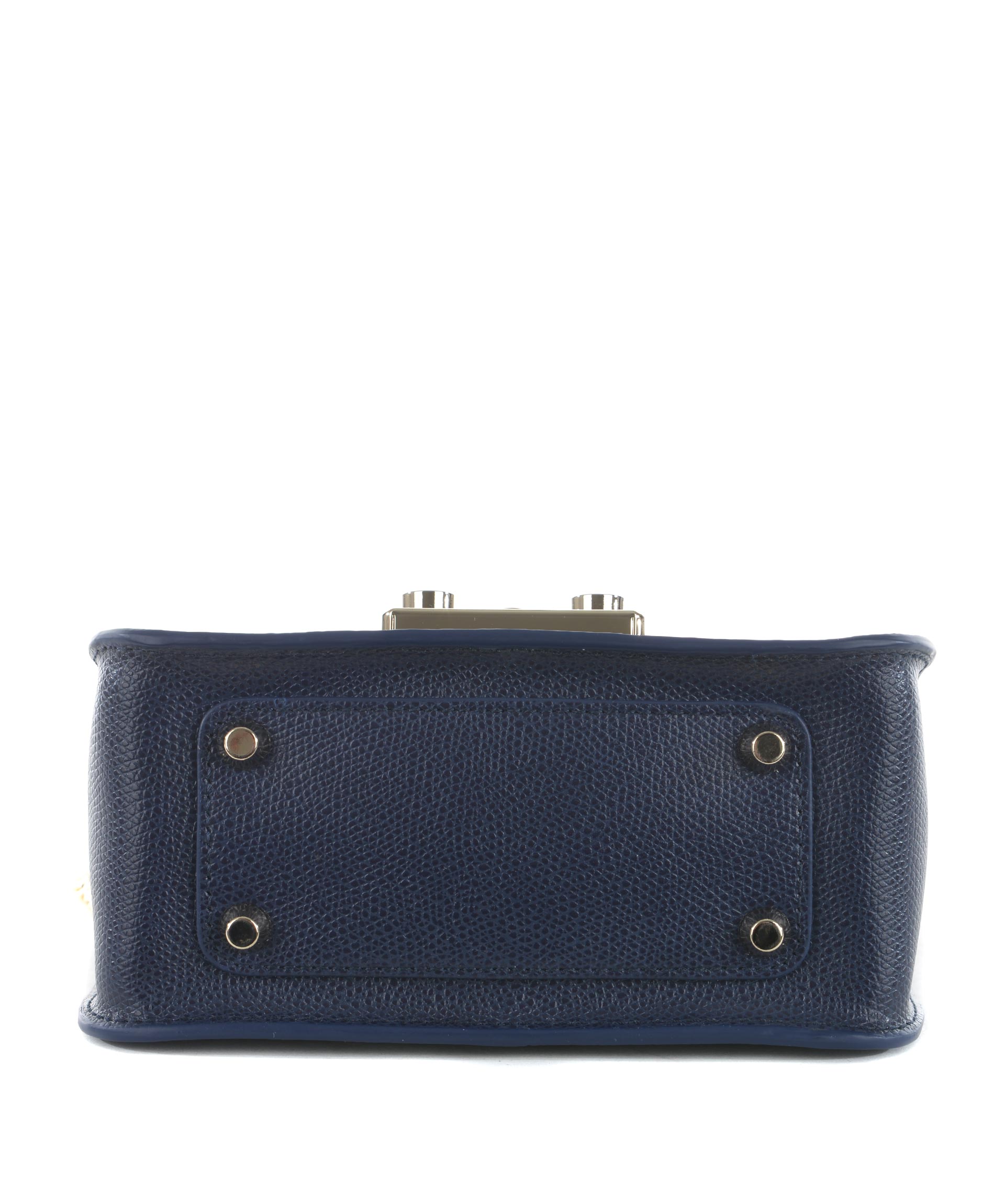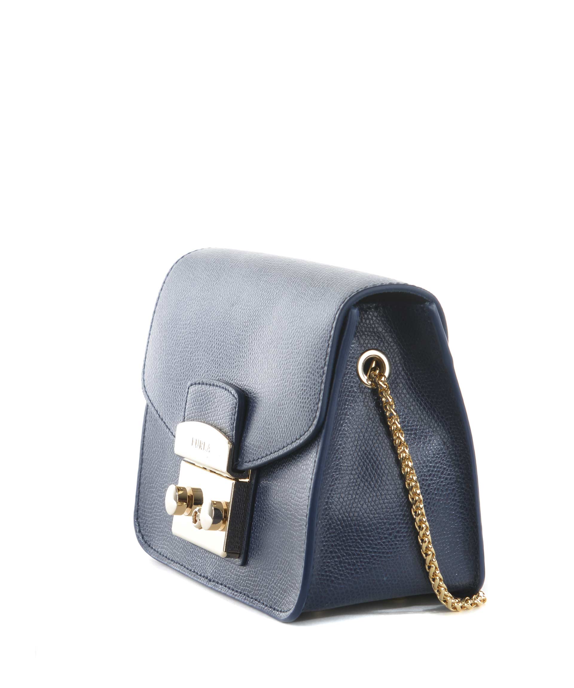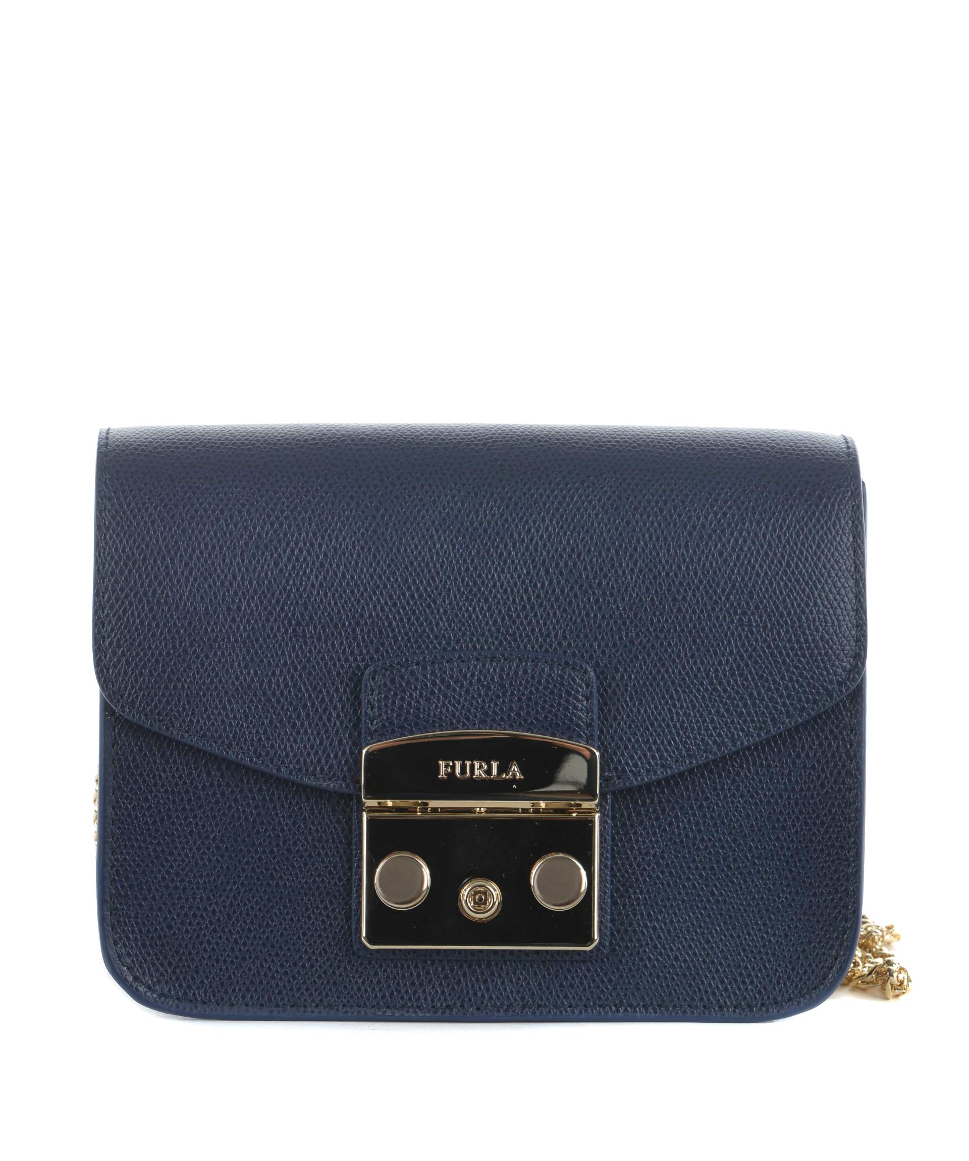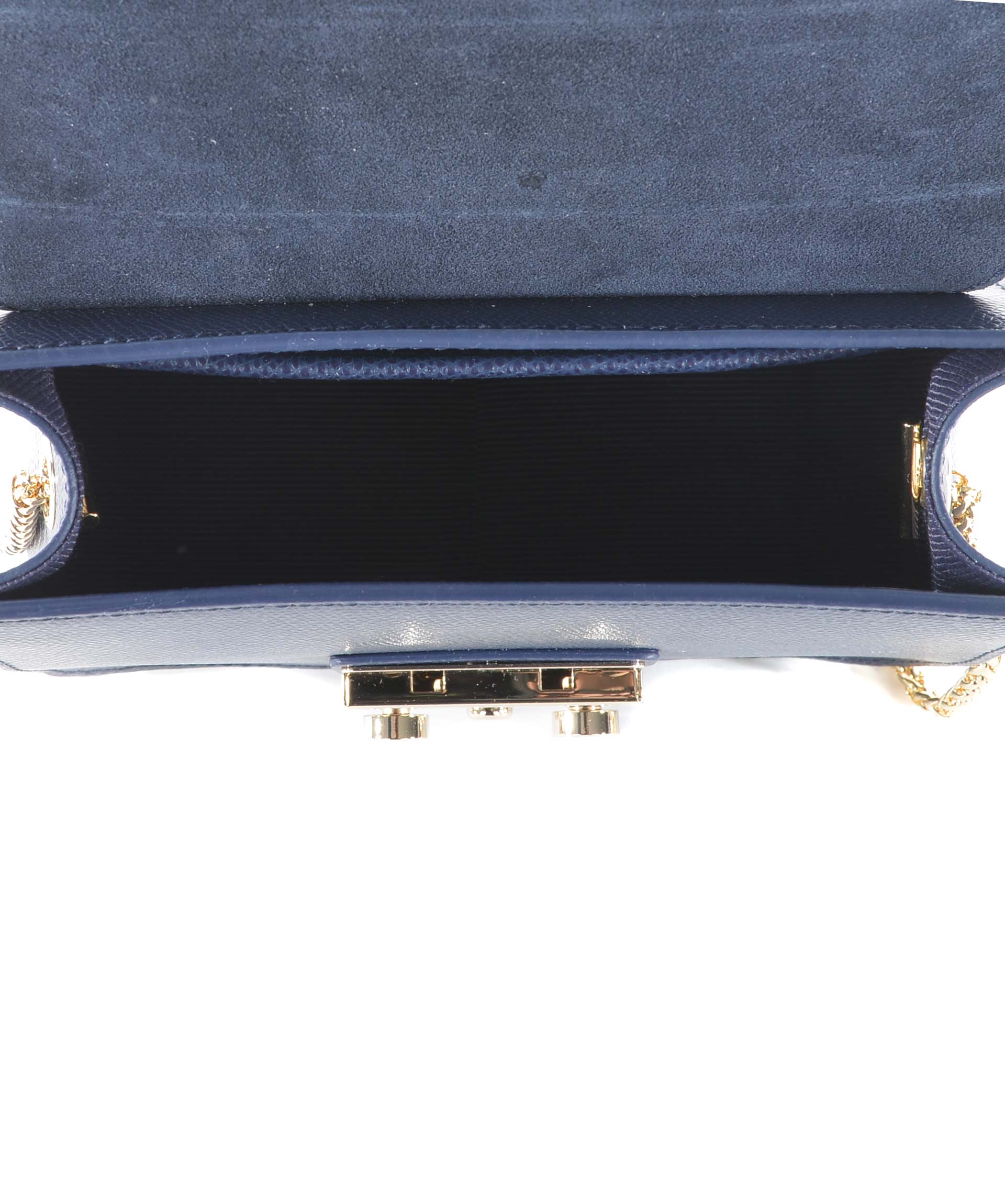 Tracolla Furla in pelle Blu. Tracolla a catena dorata. Patta frontale con apertura ad incastro. Tasca interna applicata. Foderata. Piedini metallici alla base. Placca logo frontale in metallo dorato.
