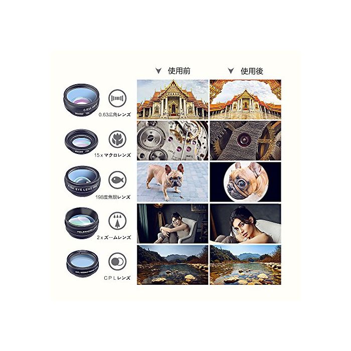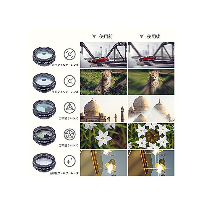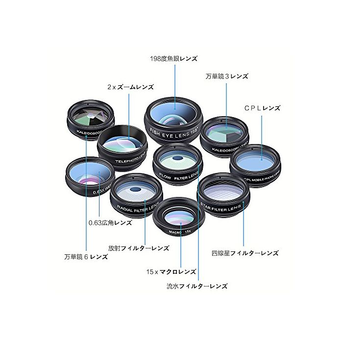 원본상품명: Akinger 10in1カメラレンズ(流水フィルタX放射フィルタX四線星フィルタXCPLレンズX0.63角レンズX15xマクロレンズX198度魚眼レンズX2XズムレンズX万華鏡3X万華鏡6