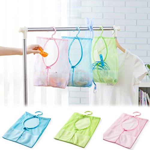 -. Feature : Multipurpose mesh clothespin bag with hanger design / Can dry underwears, socks, ect / Color:Pink, Blue and Green / As storage bags for all kinds of little things of bathroom,kitchen,home.Greatly convinient to hanging behind the door. / Kitchen Bathroom Clothesline Storage Dry Doll Pillow Shelf Mesh Bag Hook