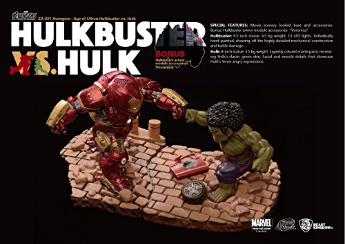 原型制作 Beast Kingdom映画『Avengers: Age of Ultron』の屈指の名場面、ハルクとハルクバスターによる大迫力の戦闘シーンを再現した「Egg Attack Avengers: Age of Ultron ハルクバスター vs ハルク」が登場です!緻密に造形されたメカニカルなアーマーのハルクバスターと、細やかなマット塗装によって隆々とした筋肉が再現されたハルクが、重厚なジオラマ風台座の上で拳をぶつけ合う姿をご堪能ください。ポリストーン製の2体をあわせた重量(台座含む)はなんと約8キロで、超重量級のバトルにふさわしい仕様となっています。ハルクバスターは各部がLEDライトで発光します。Feature