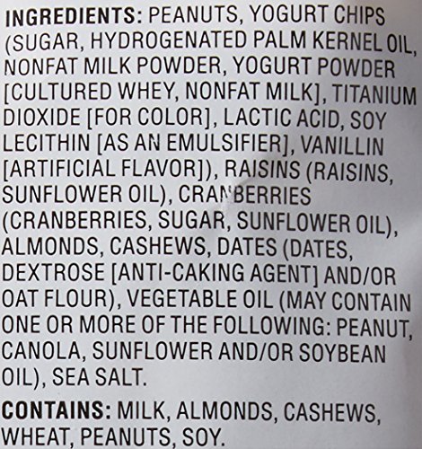- Mix of peanuts, yogurt chips, raisins, dried cranberries, almonds, cashews, and dates