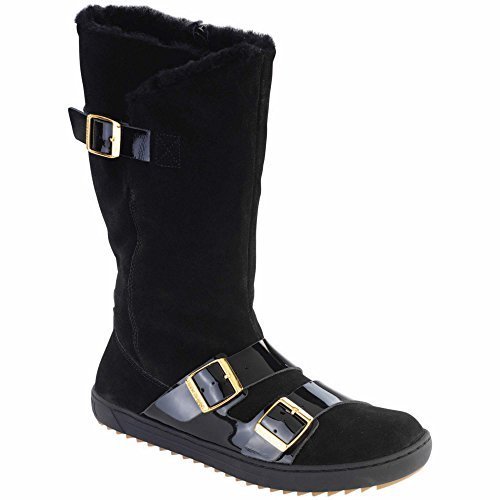 Look chic in comfortable suede boots with lamb lining, 9.5'' shaft height and 1'' non-slip rubber outsole. Comfort feature: Arch support and shock absorbing sole, Medium width. Signature staple adjustable patent leather buckles Birkenstock, Style Number: 402071.Feature