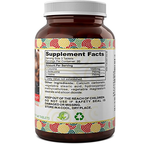 Our BCAA (branched chain amino acids) are potent, pure and natural. Our formula is designed for a 3000 mg dose (3 pills at 1000 mg each.) We stack each tab with 3 important amino acid building blocks: L Leucine, L Isoleucine and L Valine. With a specific ratio of 2:1:1, this complex delivers raw materials for your body to recover, repair and build muscle effectively even when working out and watching calories. How do they work? L Leucine: Triggers muscle growth by stimulating protein synthesis, maintains muscle mass and inhibits breakdown of lean tissue. L Isoleucine: Breaks down into a molecule called acetyl-CoA. You then burn acetyl-CoA to produce carbon dioxide, oxygen and a large quantity of energy. L Valine: Essential amino acid, required for healthy cell and organ function. These are 3 of the 9 essential amino acids you can only get from diet or supplementation. The body doesn't produce them naturally. We only put the highest-quality and best sourced ingredients into our supplements. Try a bottle of our BCAA and let us know how it changes your training results!Feature