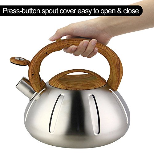 Ergonomic Spout Cover - Spring-loaded spout cover can stay open without being held, which makes operation easy and convenient. Pleasant whistle signals when water boils.
