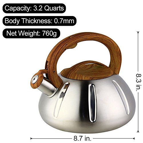 Made of stainless steel SUS 304 food grade kettle, safe and durable.Perfect gift for tea maker, coffee lover andtea lovers, Moms, friends and family. 1.Capacity: 3.2 Quarts