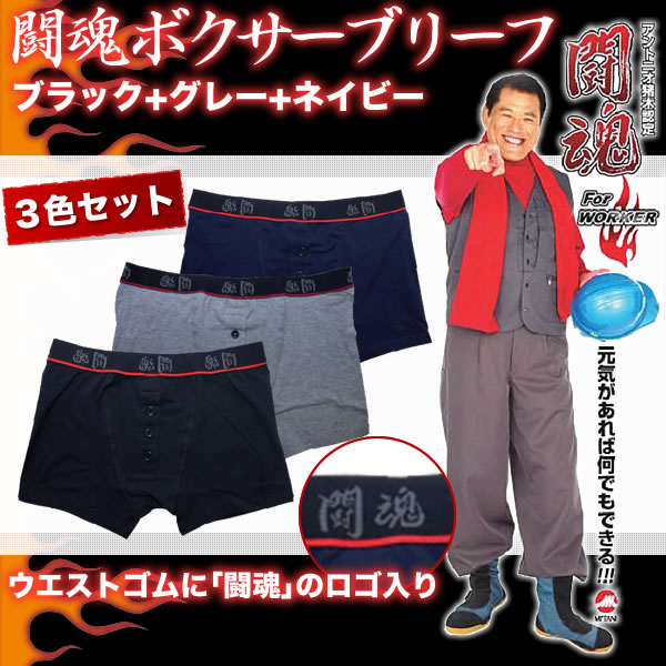 『闘魂ワーカー』シリーズからアンダーウエア登場。闘魂の刻印をウエストゴム部分に配置しました。肌触り、履き心地ともに抜群です。元気が一番、元気のための闘魂ブリーフ!Mサイズ(ヒップ:76~84cm)Lサイズ(ヒップ:84~94cm)LLサイズ(ヒップ:94~104cm) ※サプライヤー直送品  ご注文後、当日~1営業日後の出荷となります【商品名】闘魂ボクサーブリーフ 3色セット L