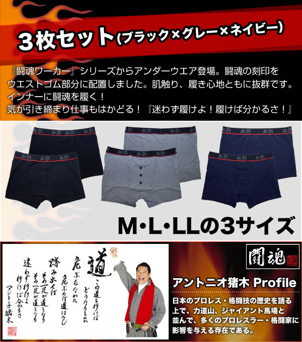 『闘魂ワーカー』シリーズからアンダーウエア登場。闘魂の刻印をウエストゴム部分に配置しました。肌触り、履き心地ともに抜群です。元気が一番、元気のための闘魂ブリーフ!