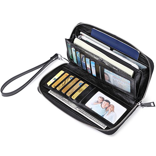 -. Feature : 100% Premium Oil Wax Genuine Leather - This women's long wallet is made with the top grade Oil Wax Leather, feels more luxury and comfortable. The ladies wallet is very stylish and durable. Looks even better after using for a long time. Wallet Dimension: 8.5"L x 4.5"W x 1.2"H / Safety, Privacy and Security - Our wallets are equipped with advanced RFID Secure Technology, It effectively protects your valuable data, Block RFID Readers from Scanning Your Credit Cards, Debit Cards, ID Cards and other RFID Cards / Premium Functionality - Our Womens RFID Blocking Wallet not only offers security, it's also very functional. It features 16 credit card slots, 2 ID windows, 4 full-length bill compartments, 1 inside and 1 outside zipper pocket. This is a Large Capacity Women's Wallet can hold all your stuffs easily. Keep your credit cards, cash, notes, receipts, checkbook, passport and your cell phone well organized. Zipper closure is designed for the safety of your properties / Carry Around Easily - Our Women's Zipper Wallet with a removeable wrist strap, it allows you to easily carry it in hand-wrist or put it in bag. You can use it as a clutch wallet when you don't want to take a handbag. Perfect for using when going out, shopping or any other daily occasions / 100% Money Back Guarantee - We know you'll love our wallet as much as we do, If for any reason you're not 100% SATISFIED, let us know and we will make things right: full refund or a free replacement, whichever you prefer