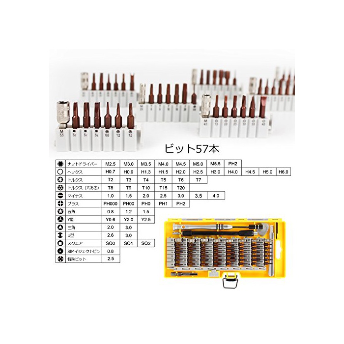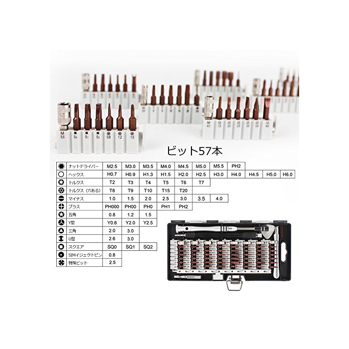 【57종류의 비트】(너트/헥스/토크《스》/이 가지/플러스/Y형/5뿔/삼각/U형/스퀘어/SIM이 더《구토핀》/iPhone기판 전용 플러스 비트)풍부한 57종류의 비트가 부착,여러가지 나사에 대응에서 옵니다.시계 안경iPhone《스마호파소콘》정밀기기의 수리 조립 등,다용도로 사용하실 수 있습니다.