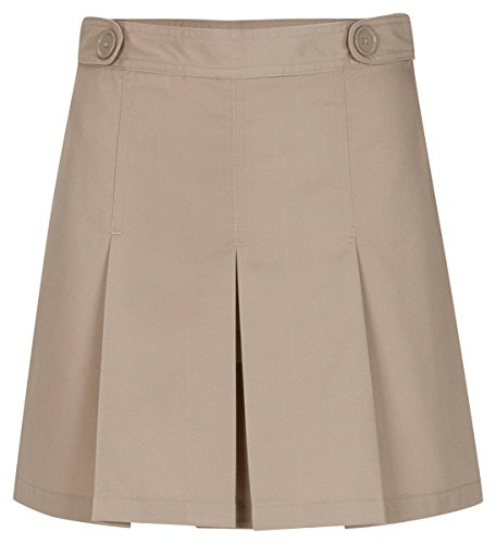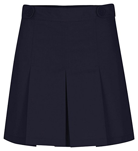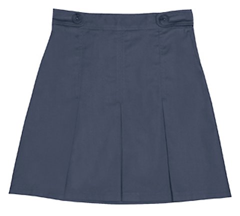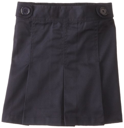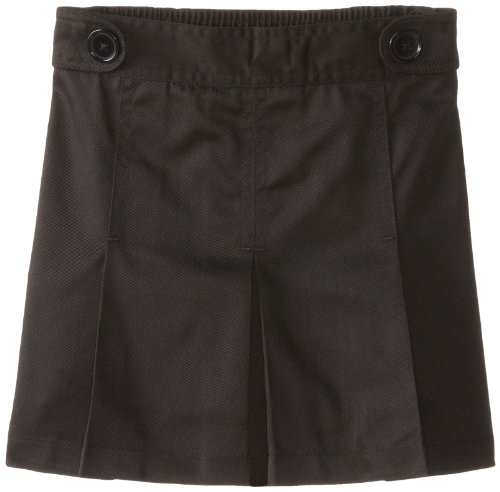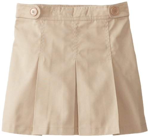 Box pleat scooter with decorative waist tabs sits lower on the hip. Full back elastic. Poly/cotton twill for easy care.