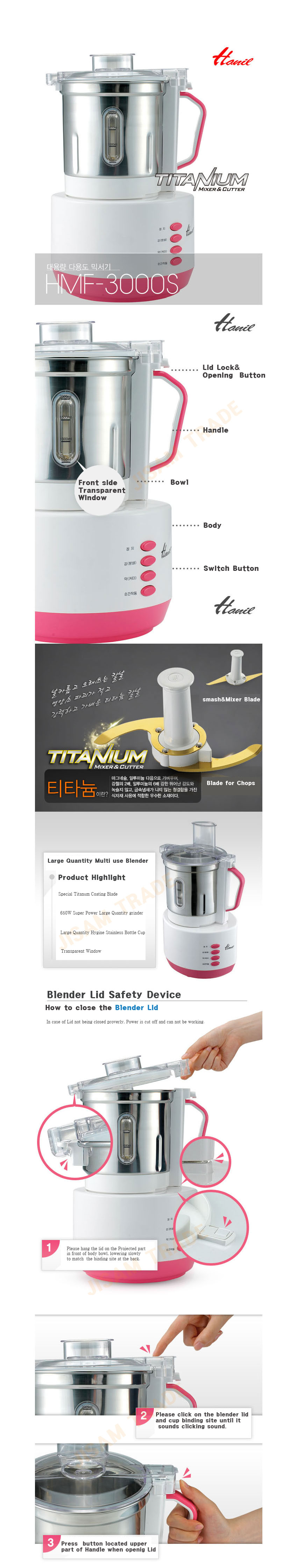 3 L Large Capacity, Stainless Steel container Hanil blender with a capacity HMF-3000S 650W for high rotation frequencies, helps grind faster, stronger all foods including foods crushing hard, but still ensure effective energy saving as well as an absolute power down the system with intelligent automation. Hanil HMF-3000S is equipped with ultra durable Titanium blades, super sure can handle almost any type of food - from fruits, vegetables and ice to help grind and mix the foods will bring real results wonderful as desired. 2 kinds of blade ; S type for chopping, Straight Type for Smashing and Mixing. We Provide Exclusive English Quick Start Guide.