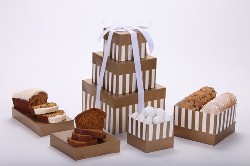-. Feature : A three-box tower filled with our most popular vegan treats / Baked in small batches and made to order / Non-GMO ingredients and organically sweetened. Traditional gourmet tower also available / Perfect gift for friends, family or as a treat for yourself / California Snowballs, Kiss of Lemon and Chocolate Chip Pecan Cookies, Carrot Cake and Zucchini Bread