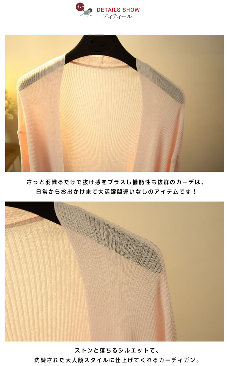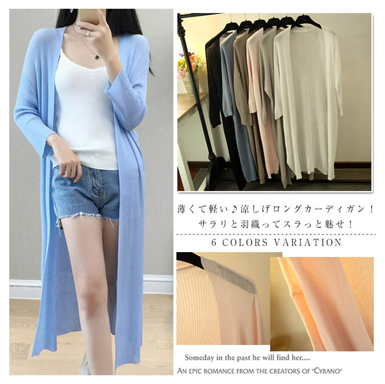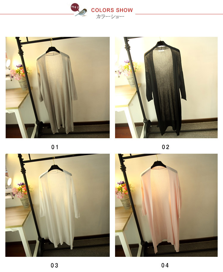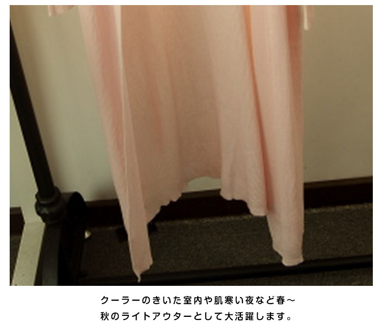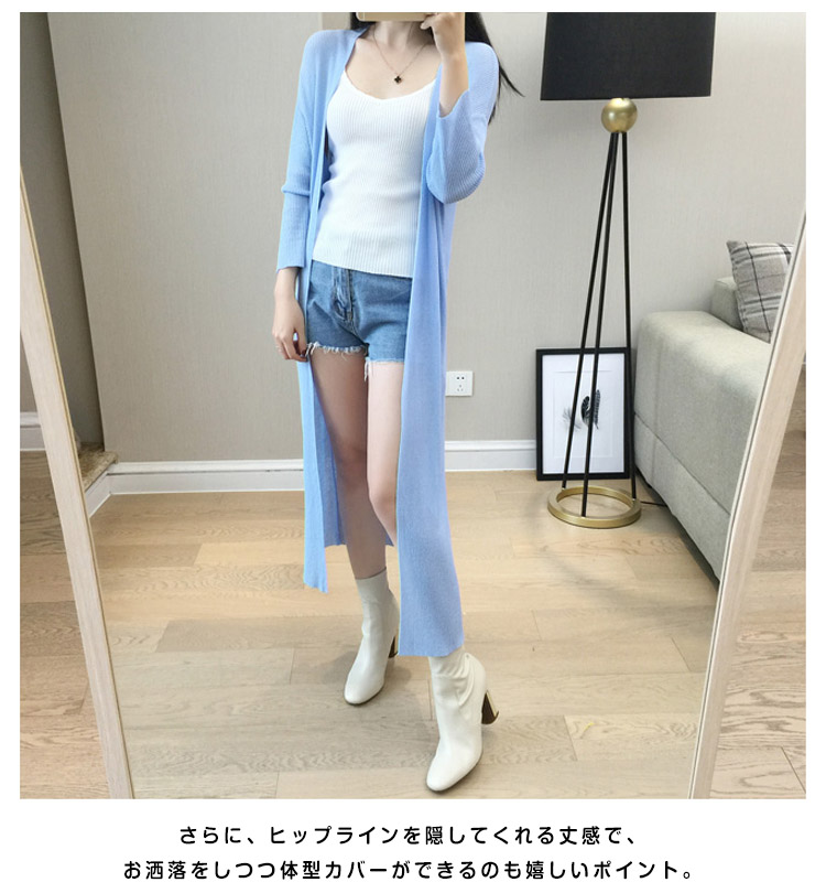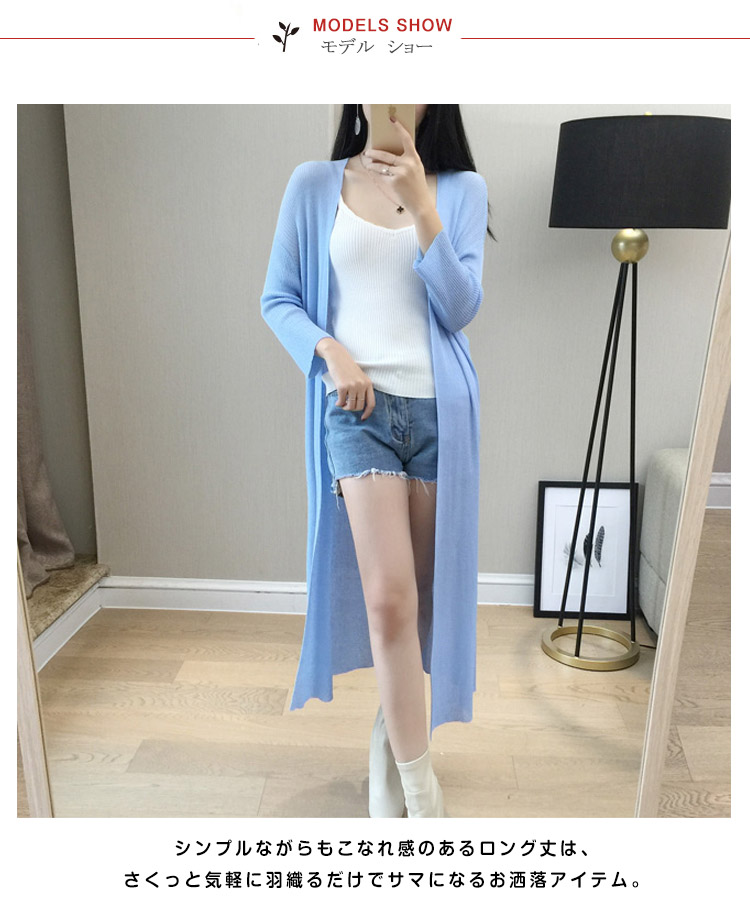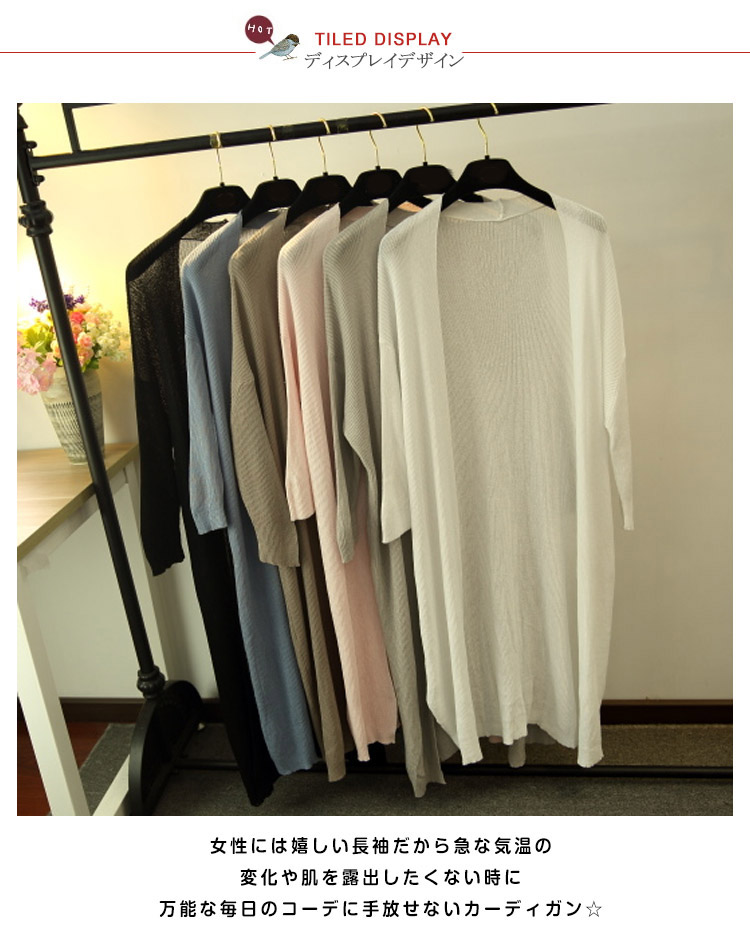 | 薄くて軽い♪涼しげロングカーディガン!サラリと羽織ってスラっと魅せ!シンプルながらもこなれ感のあるロング丈は、さくっと気軽に羽織るだけでサマになるお洒落アイテム。さらに、ヒップラインを隠してくれる丈感で、お洒落をしつつ体型カバーができるのも嬉しいポイント。女性には嬉しい長袖だから急な気温の変化や肌を露出したくない時に万能な毎日のコーデに手放せないカーディガン☆ | |