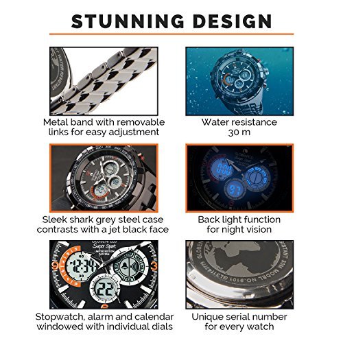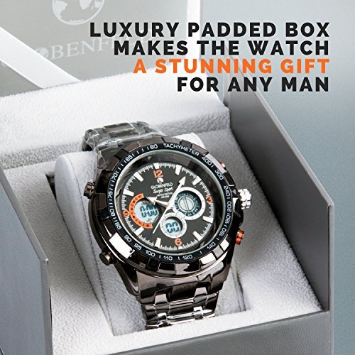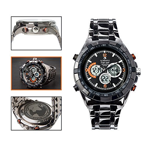 -. Binding : Misc. -. Brand : Globenfeld -. Department : Mens -. EAN : 5020260111273 -. Feature : STUNNING DESIGN - Looks and feels great on your skin. The sleek shark grey steel case contrasts with a jet black face which is framed with a tachymeter toP.R.Ing. Easily adjustable metal band ensures maximum comfort throughout the day. Great whether in the gym or in the boardroom / MULTI-FUNCTIONAL AESTHETICS - Features analog/digital display, 12/24 hour time format, alarm and stopwatch with lap/reset. Water resistant to 30m / SESTED RETAIL P.R.ICE UP TO $700 - Massive savings on a high quality, elegant watch. / THE PERFECT GIFT FOR THE SOPHISTICATED MAN - Every limited edition watch arrives in a luxury padded presentation box with two magnetic closure which make this a stunning gift for any man. Each watch features an engraved world map on the back and comes with its own unique serial number. / RISK FREE 60 DAY MONEY BACK GUARANTEE - We're so confident that you'll love your new Super Sport we'll let you try it risk free for 60 days. If it's not everything you want in a watch - simply return it to us for your money back - no questions asked. Your watch is built to last and is backed by a 5 year platinum manufacturer's warranty. -. Label : Globenfeld -. Manufacturer : Globenfeld -. Model : 9101BLACK -. MPN : 9101BLACK -. PartNumber : 9101BLACK -. ProductGroup : Watch -. ProductTypeName : WATCH -. Publisher : Globenfeld -. Studio : Globenfeld -. Title : Globenfeld Super Sport Metal Men’s Watch - Jet Black 3-Function Analog/Digital Display with Stopwatch and Tachymeter - Water Resistant to 30M - 60 Day Gurantee (Black)