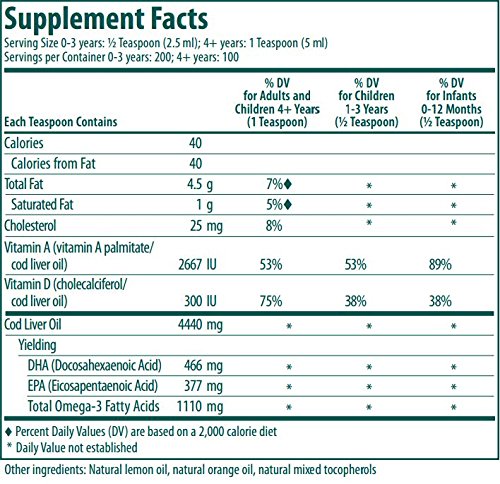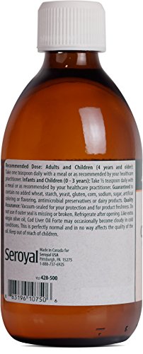 Studio : Seroyal Publisher : Seroyal Binding : Health and Beauty Product Description Cod Liver Oil Formula with Vitamins A and D - Supports cognitive function and brain and nerve development in children up to 12 years of age. Supports healthy bones, teeth, eyes, and skin. Provides 466 mg of DHA and 377 mg of EPA per teaspoon. Provides 2,667 IU of vitamin A and 300 IU of vitamin D per teaspoon. Comes in a delicious natural citrus flavor. Cod liver oil is a source of omega-3 fatty acids, which promote proper eye development, visual acuity, and pre- and postnatal brain development. Cod liver oil contains high levels of vitamins A and D, which support healthy bones, teeth, and skin. Vitamin A promotes eye health and supports proper bone growth and development. Recent research indicates that 600 IU of vitamin D per day may promote optimal bone health in both adolescents and adults. 0