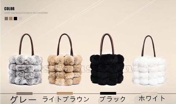 【サイズ】F幅 約15cm 高さ 約19cmハンドル立ち上がり 約19cm【素 材】本体:ポリエステルポンポンチャーム:兔毛【カラー】グレー、ライトブラウン、ブラック、ホワイト【POINT】ファーバッグは秋冬必須アイテム柔らかな手触りでボリュームたっぷりなラビットを使用、大人可愛さ溢れるバッグです。ラビットファーのボンボンがデザインされた可愛く上品なパーティーファーバッグ.【ご注意】商品の特性上、若干の毛の長さや形の違い、クセ付きなどが見受けられる場合がございます。ご使用するにつれて毛が抜けて身体に付着する場合が御座いますのでお取り扱いにはご注意下さい。