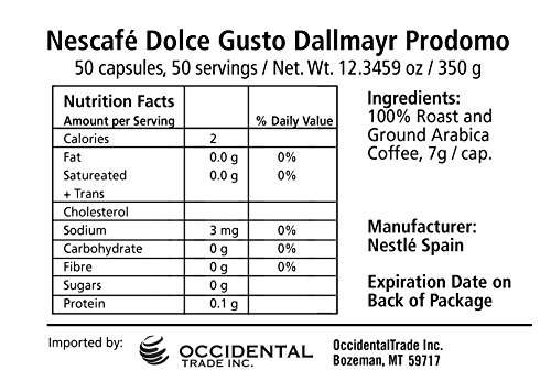 Dallmayr prodomo is a high-quality blend of the finest mountain-grown coffees from the best coffee-growing areas in the world. The special Dallmayr full aroma roasting method gives this coffee its unmistakable taste - a delight for all coffee connoisseurs. It's also suitable for those who tend to react sensitively to coffee. The special pre-roasting refinement process removes irritants and bitter components while retaining all the caffeine.Zutaten:Roasted ground coffee. 100% Arabica.Lieferumfang:1 pack Nescafé Dolce Gusto Dallmayr prodomo with 50 capsules for 50 servings. Net weight / pack, 7g / capsule