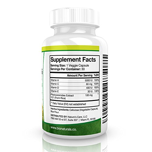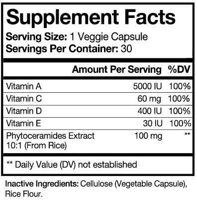 NOURISH YOUR SKIN & REDUCE WRINKLES - Our unique formula derived from plant ceramides improves skin hydration and quality and works to strenghten skin cells. Combined with Vitamins A C D and E, this supplement aids in preventing premature aging and helps skin to look vibrant, healhty and youthful.