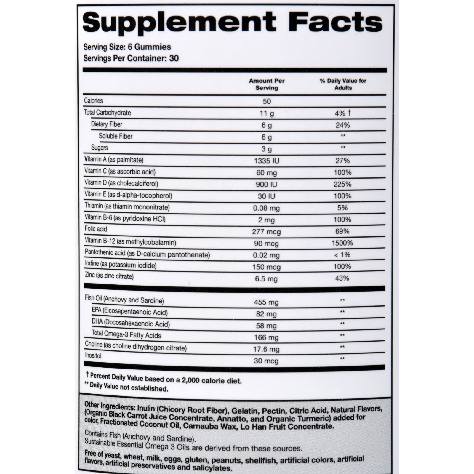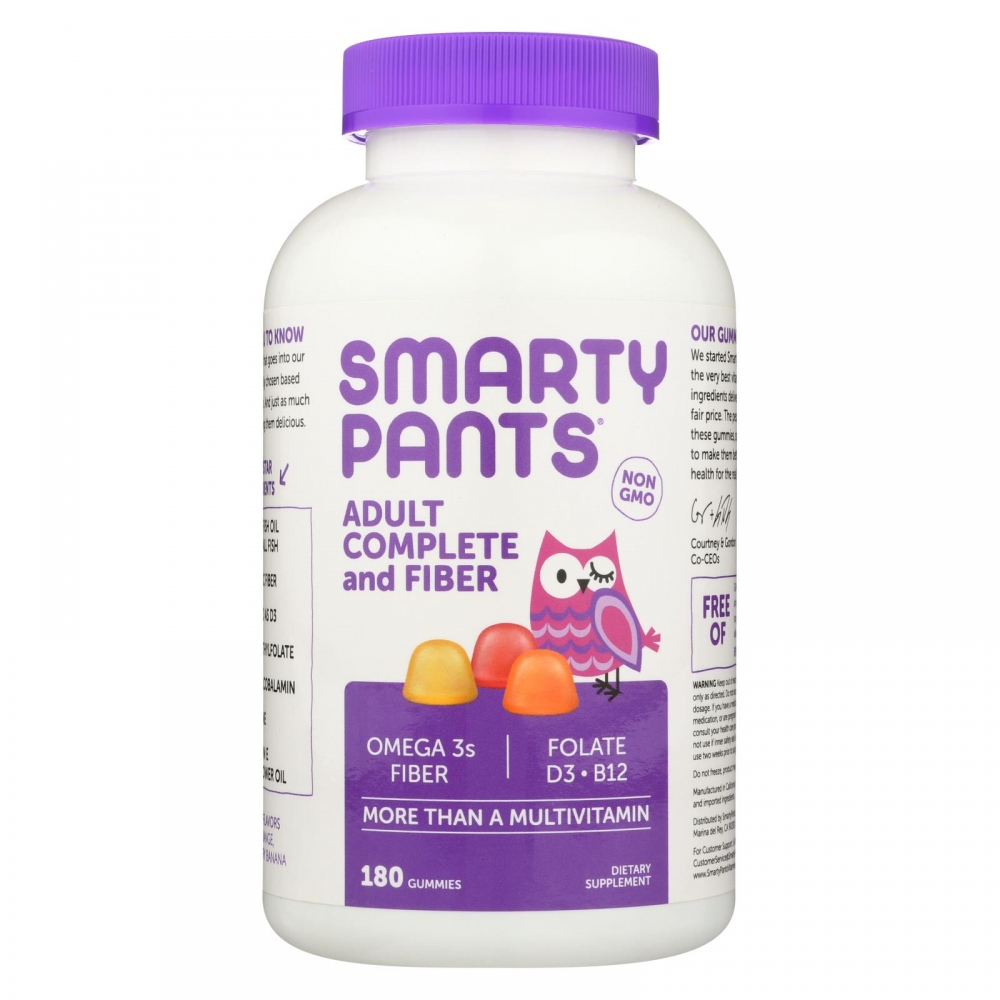 | Please. Stop. Stop taking multiple supplements for multivitamin, fish oil, B12, and fiber. Stop taking a vitamin that isn't delicious. Take Smartypants Adult Complete + Fiber Gummies, the only all-in-one gummy multivitamin with omega 3s, vitamin D3, B12, fiber and no sugar added. Packed with 6g of fill-you-up soluble fiber, SmartyPants Adult Complete + Fiber gummies are made with only the highest quality ingredients in a 3rd party tested GMP certified facility, with no caffeine and no artificial stimulants. Made with natural ingredients, natural colors and flavors and no high fructose corn syrup. Gluten and casein free. SmartyPants never uses any artificial flavors, sweeteners, preservatives or dyes. SmartyPants Adult Complete + Fiber can help you feel full, control weight and get you the nutrients you need for optimum health. Ingredients : Vitamin A, Vitamin C, Vitamin D, Vitamin E, Thiamin, Vitamin B-6, Folic Acid, Vitamin B-12, Iodine, Zinc, Omega 3 EPA and DHA derived from small fish, Choline, Inositol, Inulin (Chicory Root Fiber), Gelatin, Pectin, Citric Acid, Natural Flavors, Colors from Natural Sources (Black Carrot Juice Concentrate, Annatto, Tumeric), Fractionated Coconut Oil, Carnauba Wax, Lo Han Fruit Concentrate. Free of yeast, wheat, milk, eggs, soy, gluten, peanuts, tree nuts, shellfish, artificial colors, artificial flavors and salicylates. Country of origin : USA Gluten Free : Yes Yeast Free : Yes Wheat Free : Yes Size : 180 CHEW Pack of : 1 Product Selling Unit : each |