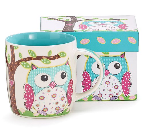 Product DescriptionDishwasher safe/FDA approved/Microwave safe. White mug with owl and tree design and teal interior. Bone China decal design.0