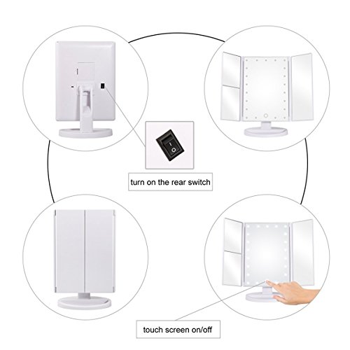 NEWQIBEAUTY Trifold Lighted Makeup Mirror with 22 LED Lights ,Touch Screen,Battery and USB Power Supply,3X/2X/1X Magnification 180° Adjustable Lighted Vanity Mirror