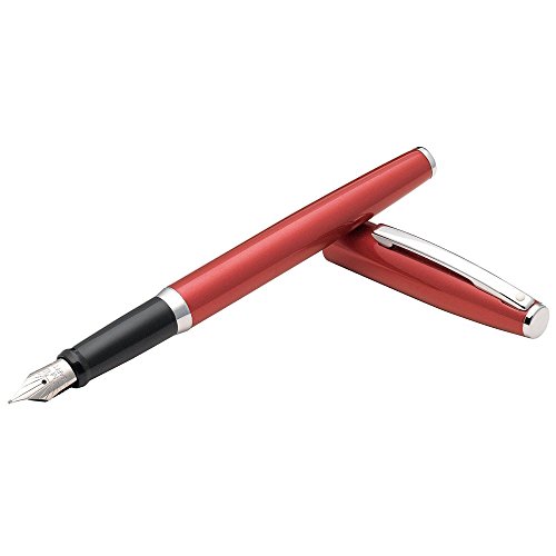 -. Feature : Metallic Red featuring Chrome Plate Trim / Fountain pen features a Stainless Steel Nib / Features a glossy resin gripping section for comfort and control / Includes Sheaffer Skrip ink cartridges one blue and one black plus a piston convertor / Packaged in a luxury gift box