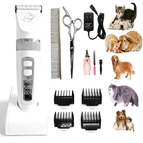 [2018 New Version]Dog Grooming Clippers Cordless Quiet Rechargeable Dog Grooming Kit for Thick Coats, Heavy Duty, Cats, Horse Professional Dog Hair Trimmer with 4 Combs, Guides, 2 Scissors, Nail Kits