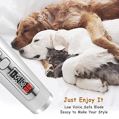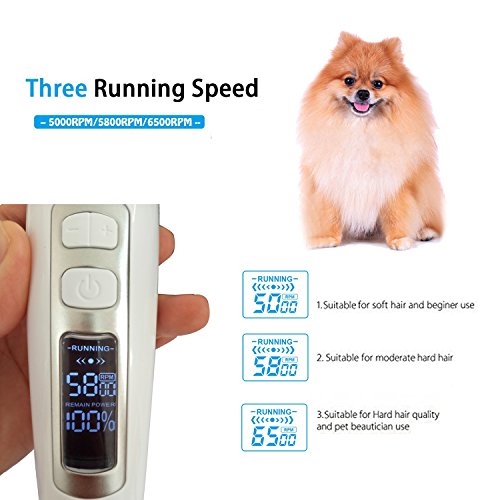 - ★【LCD DISPLAY and THREE VARIABLE SPEED】LCD display shows Rotating Speed, Power Percentage, Oil indicator and Charge indicator. 3 speeds as below: 5000RPM/5800RPM/6500RPM. cuts very cleanly with no pulling of the pet hair. Right side charging light will flash when power's less than 15%. Please charge immediately. Beginner can also use it effectively.