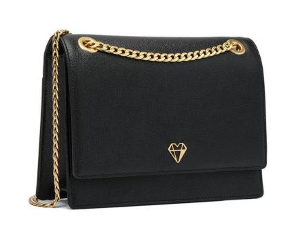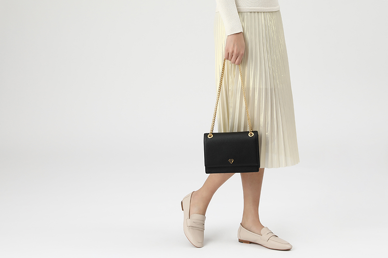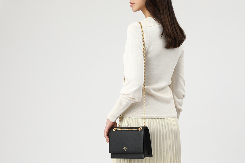 심플한 박스형의 디자인에 쁘띠 다이아몬드 패턴의 메탈 장식을 매치하여 포인트를 준 숄더백입니다.