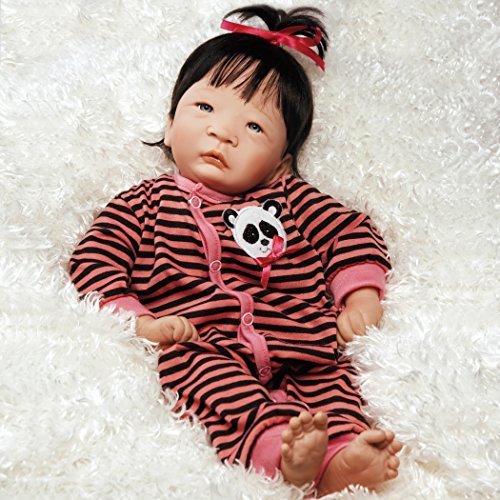 She is one of the cutest Asian baby dolls! You won't be able to resist Su-Lin's contagious grin sandwiched between her two plump cheeks! This adorable Asian baby is dressed in a soft faux fur Panda Bear outfit with a removable hoodie. It's obvious why her name means "A little bit of something very cute"! Embroidered paws adorn her hands and feet, and two pink bows that accent her Panda ears complete her wildly cute costume! A delicate pink organza bow ties gently under her little chin. When her outfit is removed, she reveals a unique Panda bear and hearts print pattern on her body! Su-Lin's brown almond shaped eyes and button nose add to her playful and innocent look. She's just un"bear"ably loveable! You won't want to put this little cub down once you have her in your arms!