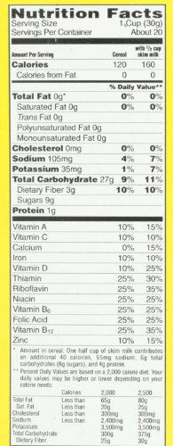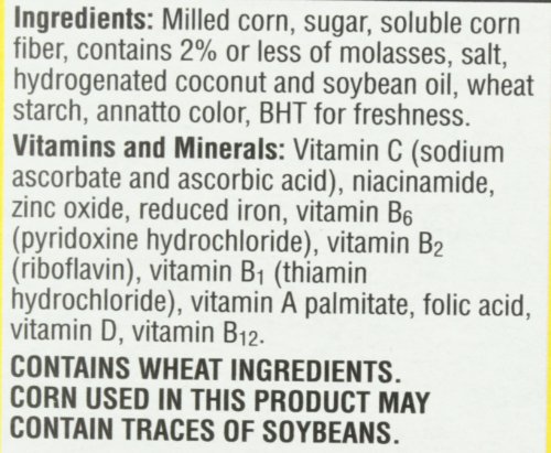 -. Feature : Crunchy puffed-corn cereal is vitamin fortified and contains healthy fiber / 3-grams of fiber per 120-calorie serving; 11 essential vitamins; zero fat / Classic and fun breakfast cereal that the whole family will love