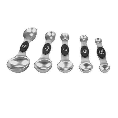 Finish guessing work for how much spices will be put on the dish. High quality,durable and stylish measuring spoons help you solve this problem in daily cooking at home. A perfect set of 5 stainless steel spoons, long lasting and durable for cooking. There are magnetic in the middle of every spoon,which enable each spoon to be stick together,easy for carrying and storing. The oval end design is for most spice jars while the round one is for liquids.
