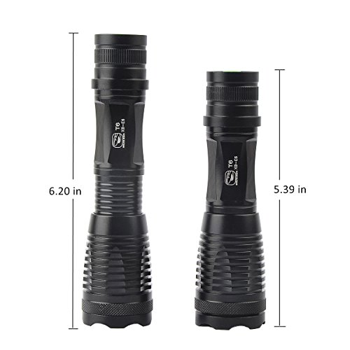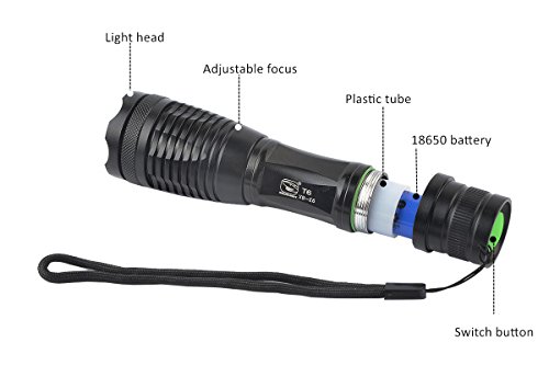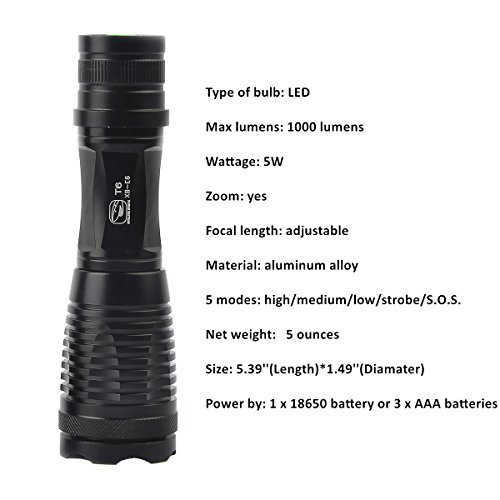 -. Feature : Reverse polarity protection: protect the LED light do not burn out if the battery installed backward / Adjustable focus range for different usage, stretching to adjust its focus / 5 switch modes: high/medium/low/strobe/S.O.S., you can choose the modes according to your need / Skid-proof and water resistant design, best suitable for outdoor camping, climbing, cycling, etc / Power Source: 1 x 18650 rechargeable battery(Included) or 3 x AAA batteries (not Included), allow for easy replacement battery anywhere in the world.
