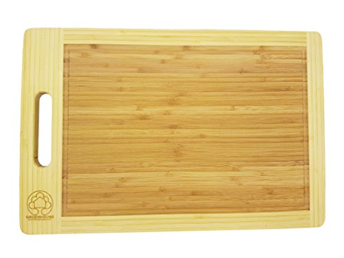 NATURAL ORGANIC BAMBOO: Our wooden cutting board is made of 100% natural, sustainable and organic bamboo, which makes it ecofriendly and stronger than a maple cutting board. It also features an easy-to-carry handle for transporting food and a drip groove to reduce spillage while preparing food.