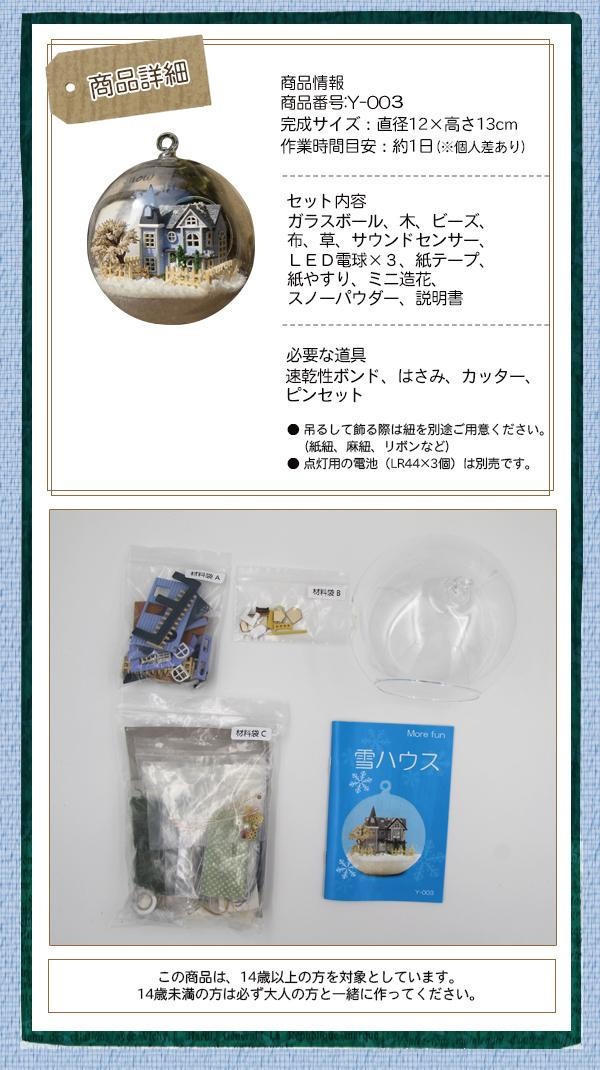 | セット内容 | ガラスボール、木、ビーズ、布、草、サウンドセンサー、LED電球×3、紙テープ、紙やすり、ミニ造花、スノーパウダー、説明書 |