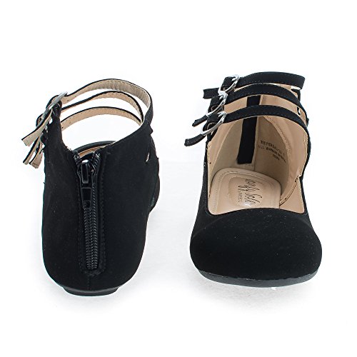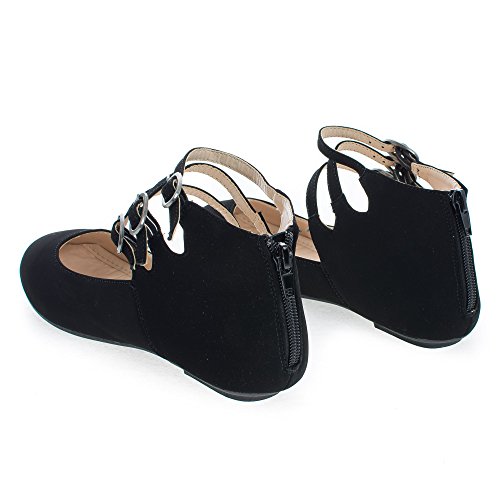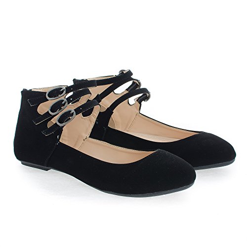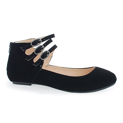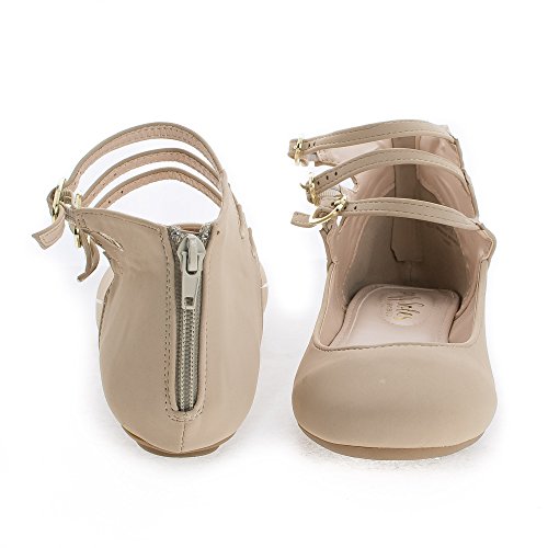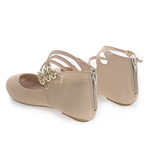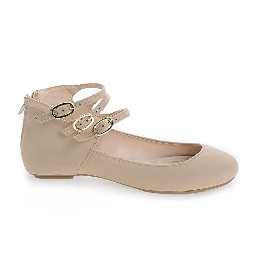 Binding : Apparel Product Description Walk in extra comfort in these extra cushioned insole ballet flats, featuring a round toe, contrast stitching, triple buckle ankle cuff straps, a back center zipper for easy wear and closure, an extra cushioned insole for extra comfort, and an approximate 0.25 inch heel. design fits true to size. Available in Black, Nude (Beige), etc. All man made materials. By Aquapillar. 0