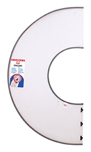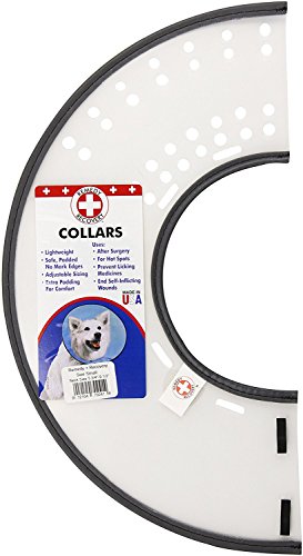 Lightweight plastic half circle with vinyl padded neck for extra comfort. Folds and snaps to form a cone around the animal 's neck to prevent it from chewing or licking a sensitive area, bandages, wounds or open sores. Special holes at the neckline allow for attaching to collar to hold the snaps behind the head and allow for total peripheral vision.