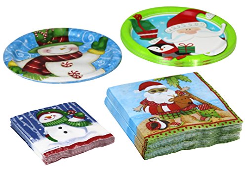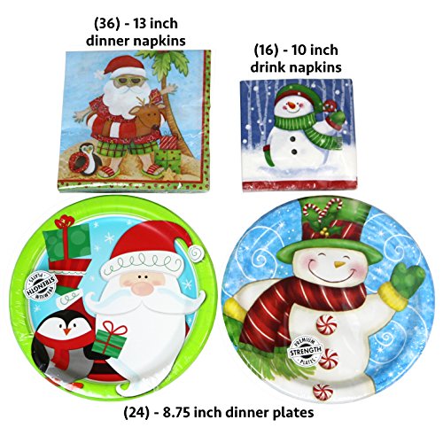 Product Description Fun paper plates and napkins for a Christmas or winter party. Snowman and Santa designs. Includes: (24) - 8.75 inch dinner plates, (36) - 13 inch dinner napkins, and (16) - 10 inch drink napkins. 0
