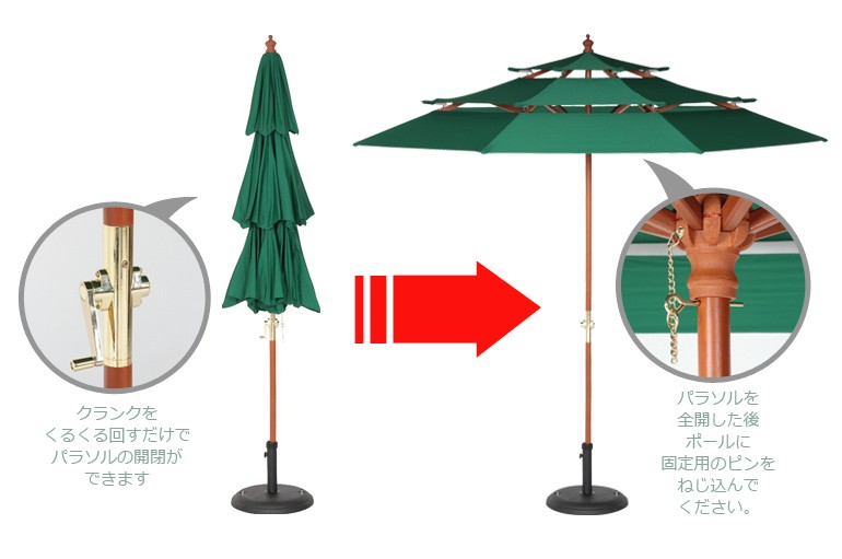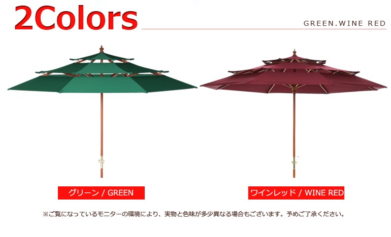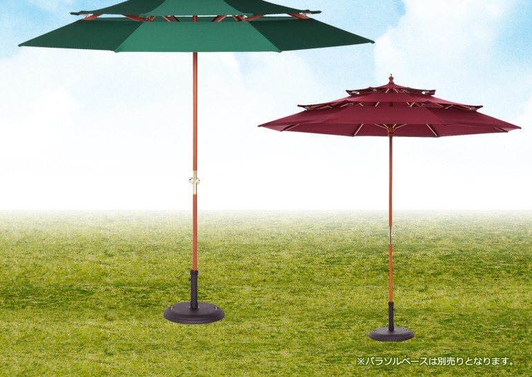 …━━……━━…★★SPEC・商品名:三段パラソル・サイズ:〔全体〕幅270x奥行270x高さ239.5(単位:cm)・素材:ポリエステル、天然木・カラー:グリーン、ワインレッド・特長:ポール径 : Φ38、3段パラソルベースは別売りとなります。☆*★*☆*★*☆*★*☆送料の案内・東北・北海道追加送料「地域別追加送料選択肢を必ずご確認ください。」