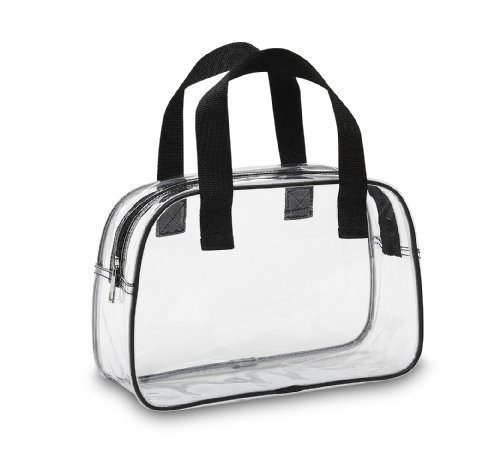 This basic clear handbag is perfect for those who need a clear bag for work or for sporting events. Basic clear handbag with black trim Strong nylon webbing handles Sturdy construction Top zipper closure Meets employer/stadium guidelines for clear bags Measures 11.5 " W x 7.5 " H x 4 " D Handle drop 5 inches.