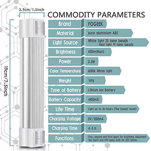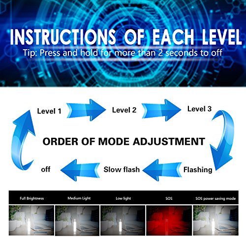 【5 Level Brightness】20 white-light LED Bulbs,19 red-light LED Bulbs. Strong light, Bright light, Flashlight, you can change the mode by pressing switch button. When fully charged ,the magnetic lantern works for almost 7 hours at full brightness,15 hours for medium light,36 hours for Low light,13 hours for SOS and 18 hours for SOS power saving mode.