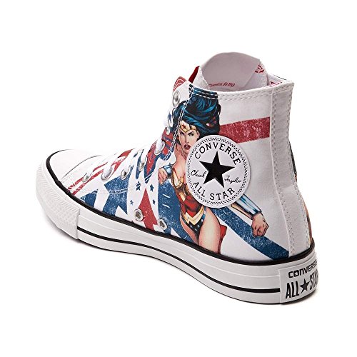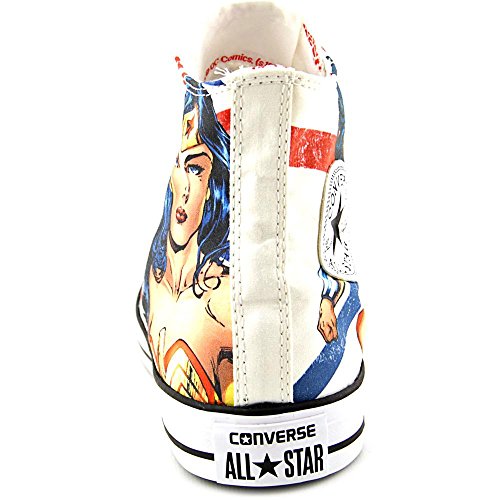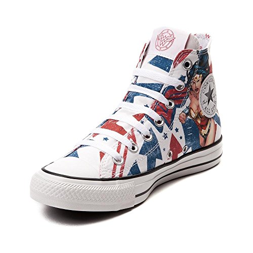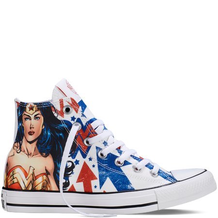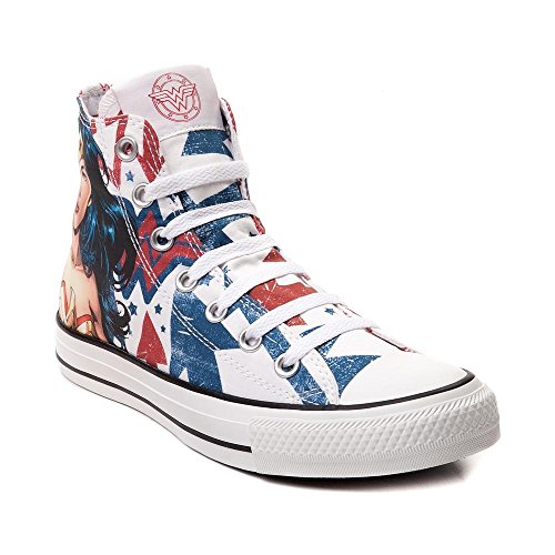 -. Binding : Apparel -. Brand : -. Color : White -. Department : unisex-adult -. Feature : Canvas upper in a high-top athletic sneaker style with a rubber cap toe / Bright screen-printed graphics / Lace-up front with metal eyelets / Textile lining with cushioned insole / Textured rubber outsole -. ProductGroup : Shoes -. ProductTypeName : SHOES -. Title : Chuck Taylor Men's Sneaker DC Comics Wonder Woman