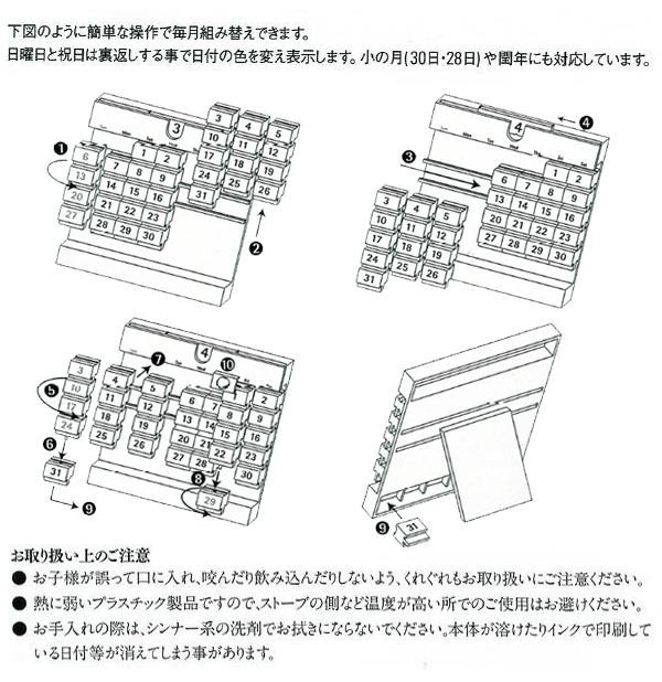 日付けの部分を入れ替えて、毎年使うことができるカレンダーです。シンプルなつくりなので飽きがこず、インテリアにもマッチします。小の月(30日・28日)や閏年にも対応しています。 |