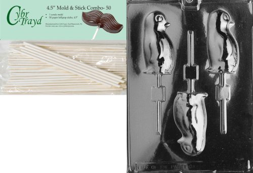 Cybrtrayd 45St50-A011 Penguin Lolly Animal Chocolate Candy Mold with 50 4.5-Inch Lollipop Sticks