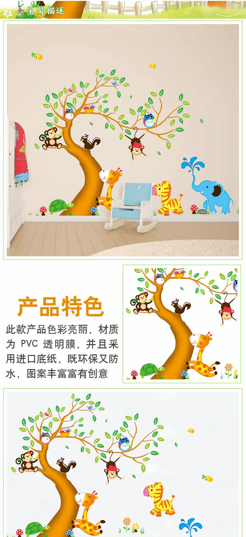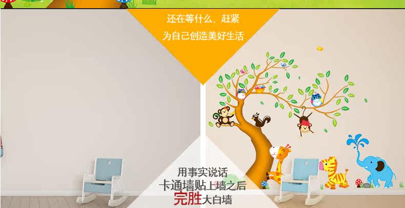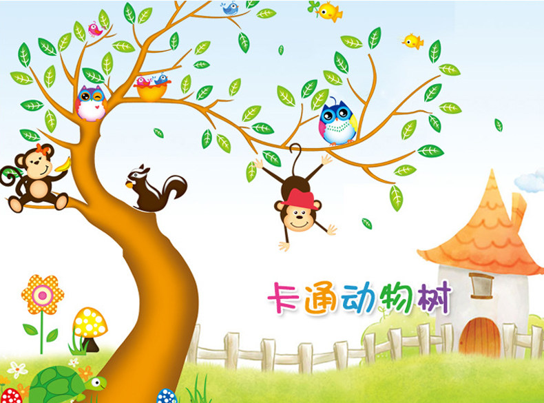 儿童房可爱卡通装饰墙贴欢乐动物树可移除贴画客厅卧室背景墙贴纸