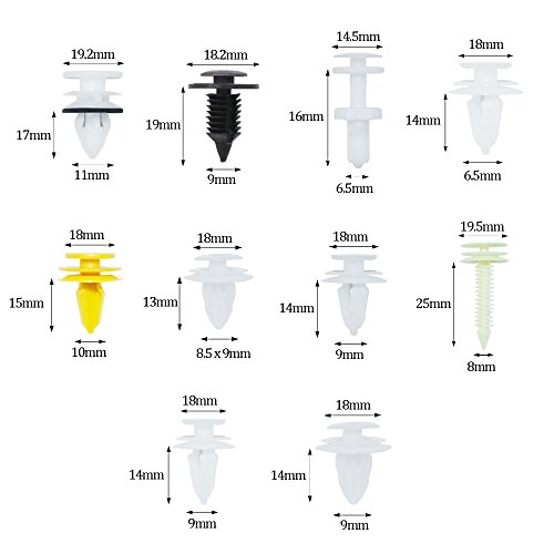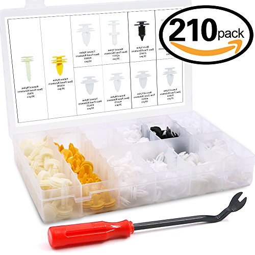 Great for various car brands such GM, Ford, Chrysler, Toyota BMW and etc, applicable to most models These clips can be used for door trim, car fender, bumper, side skirt, radiator shield, splash shield retainers, easy to install Along with a removal tool which is made of chrome plated carbon steel, strong and durable, can help you quick remove clips without damage to automotive There are 10 type 210Pcs total and a strong removal tool in a convenient storage box to meet your needs